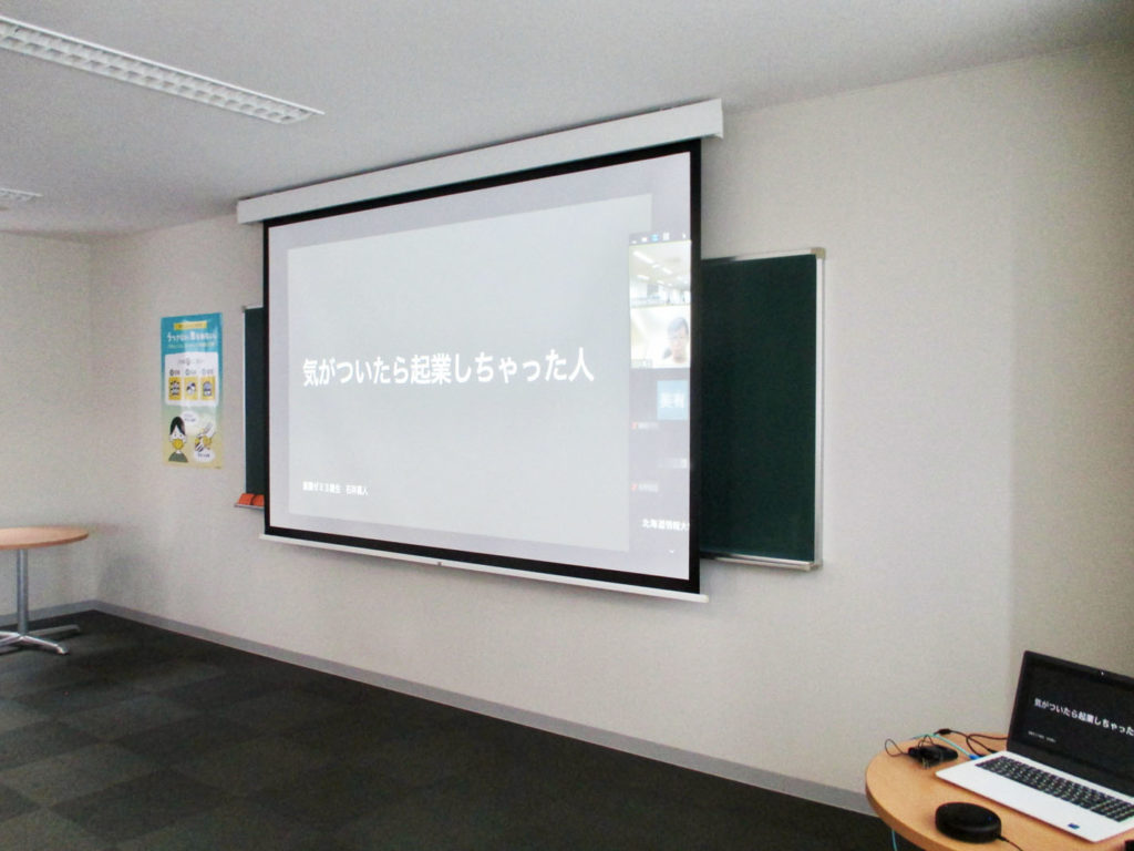 ハイブリッドゼミで,東京から卒業生にお仕事について講演をしてもらいました。