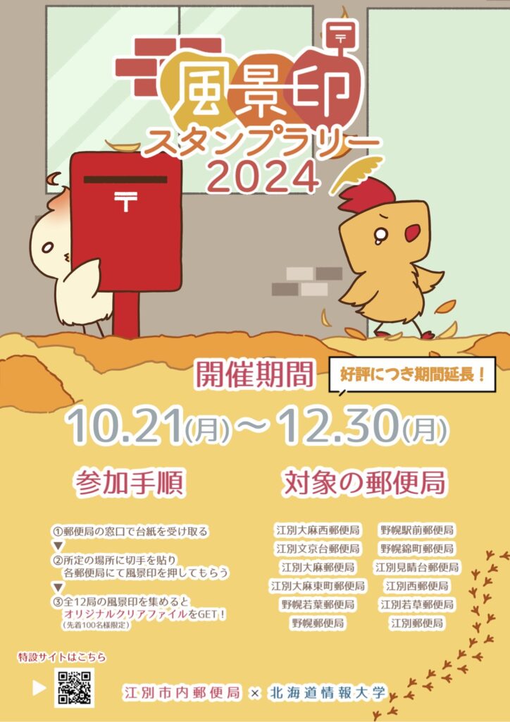 11月中に訪れることができなかった方や、全て回りきれなかった方は、ぜひこの機会にご参加ください。 また、スマートフォンサイトでは、11月最終週に公開した達成者向けの追加コンテンツも引き続きご覧いただけます。 風景印2024ポスター日付修正版吹き出し付き #風景印 この記事を開く → トップへ戻る → 前の記事 ← 江別市情報図書館でインタラクティブ絵本の展示を行いました。 次の記事 大学院公開論文説明会 →