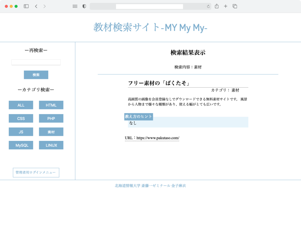 2019年度の卒業研究で開発した教材検索サイトmymymyを学内で試験運用しています。 教材検索サイトmymymyとは(PDF) 教材検索サイトmymymy(学内リンク) #SA支援 この記事を開く → トップへ戻る → 前の記事 ← 2020年度のゼミスタート。 次の記事 ゼミ生サイトに18期生を追加しました! →