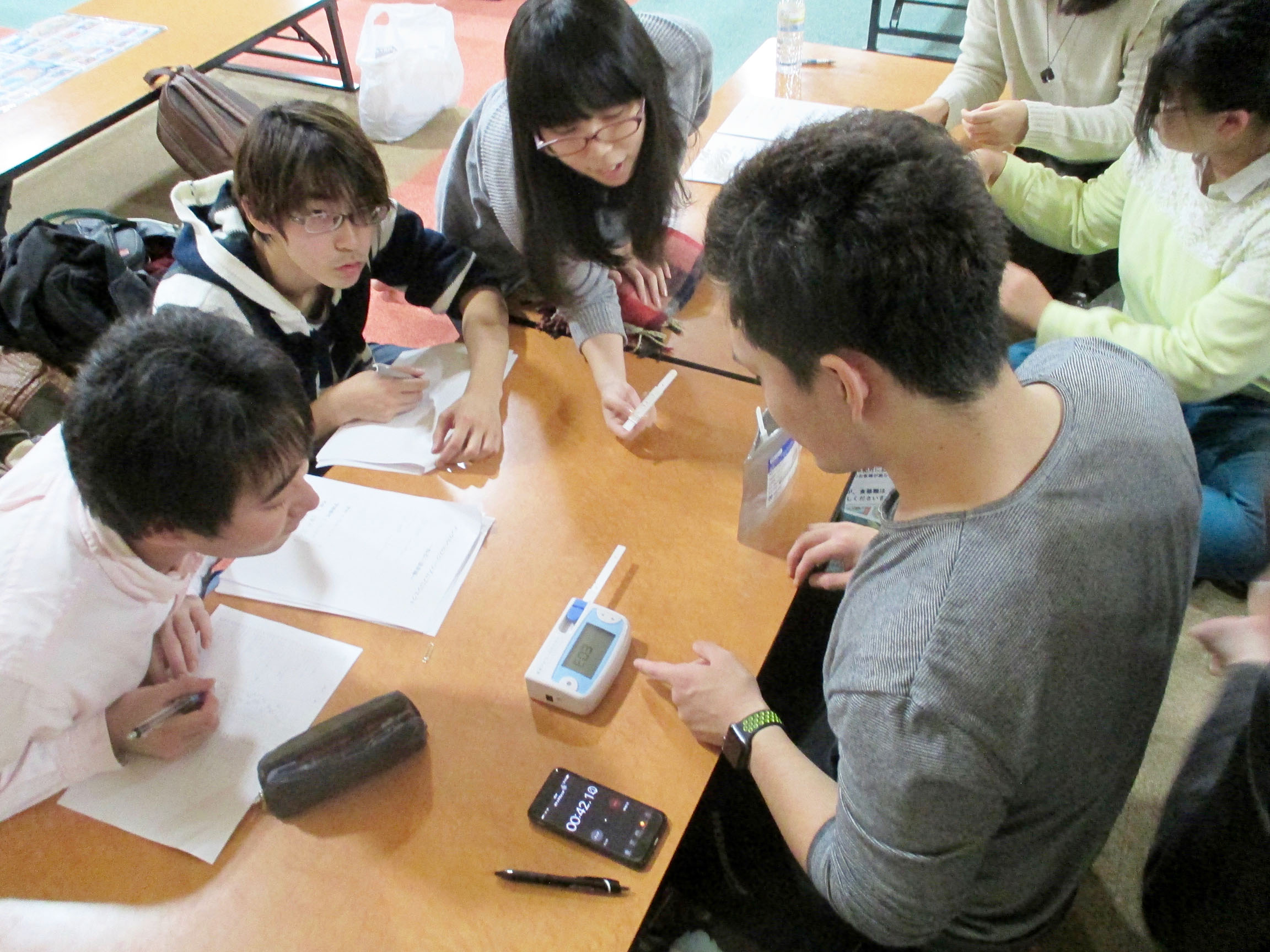 プロジェクトでは,入浴前後の唾液アミラーゼによる『ストレス値』の測定と,POMSを使った『気分』の測定を組み合わせた,温泉のストレス軽減効果に関する実験を行っています。