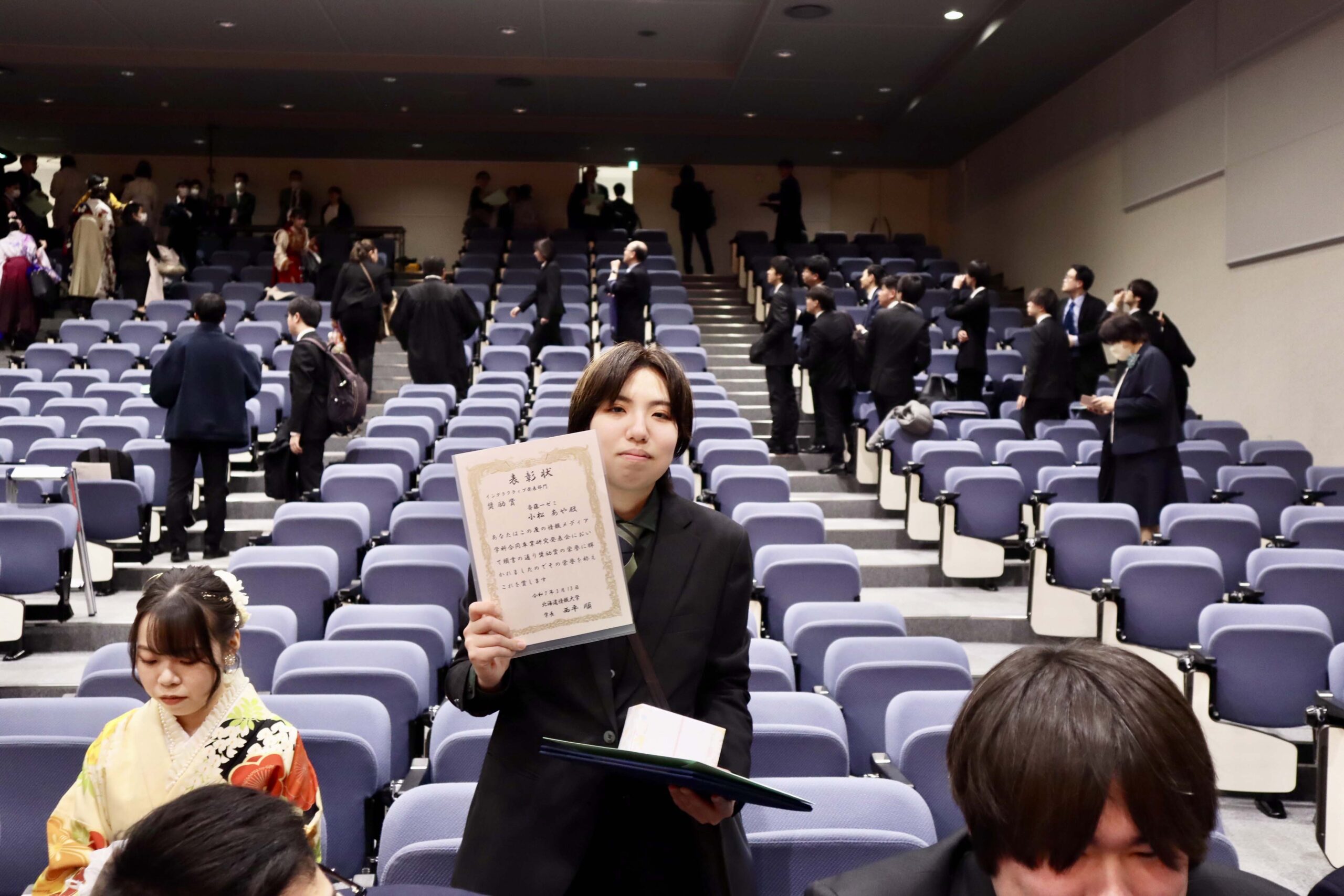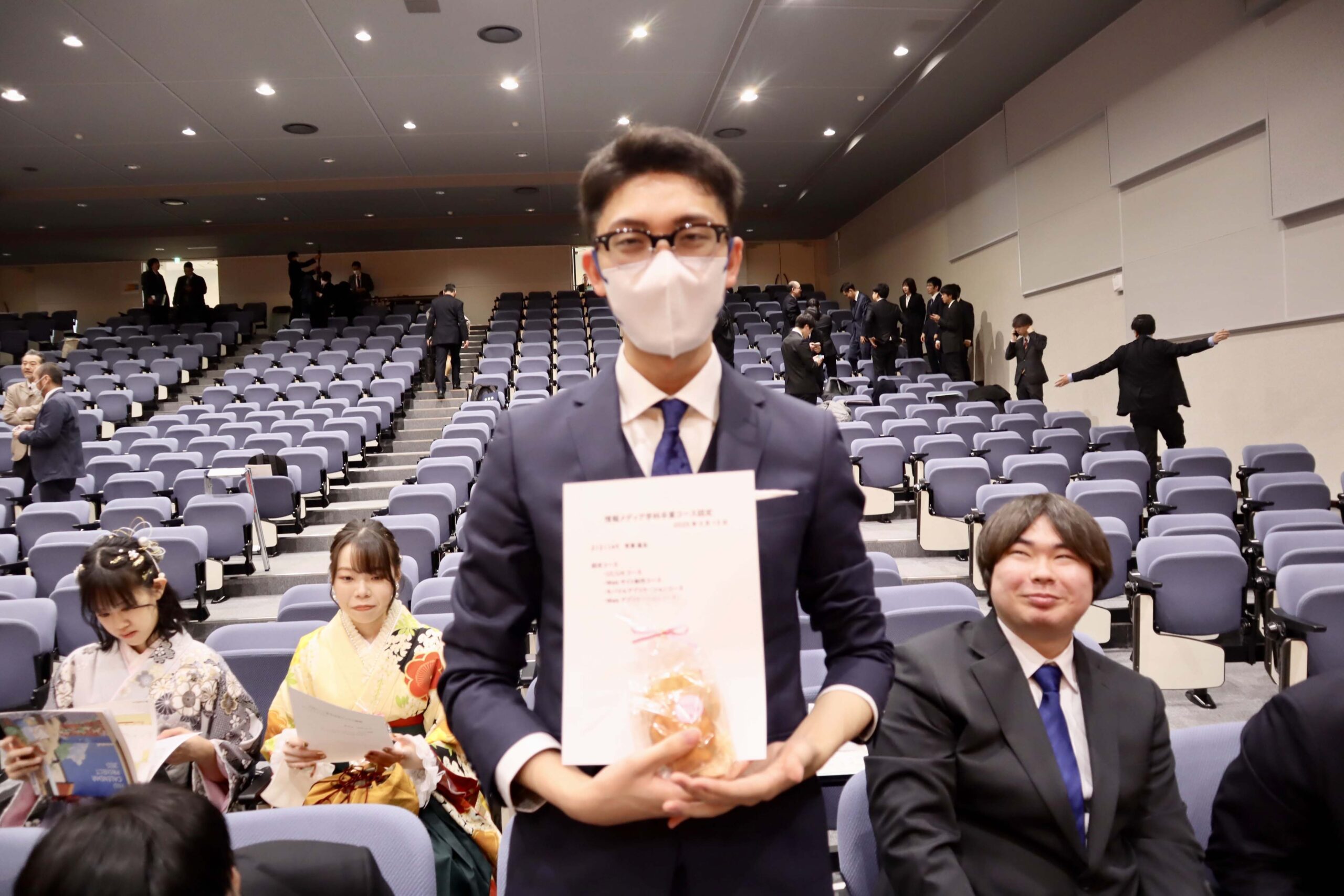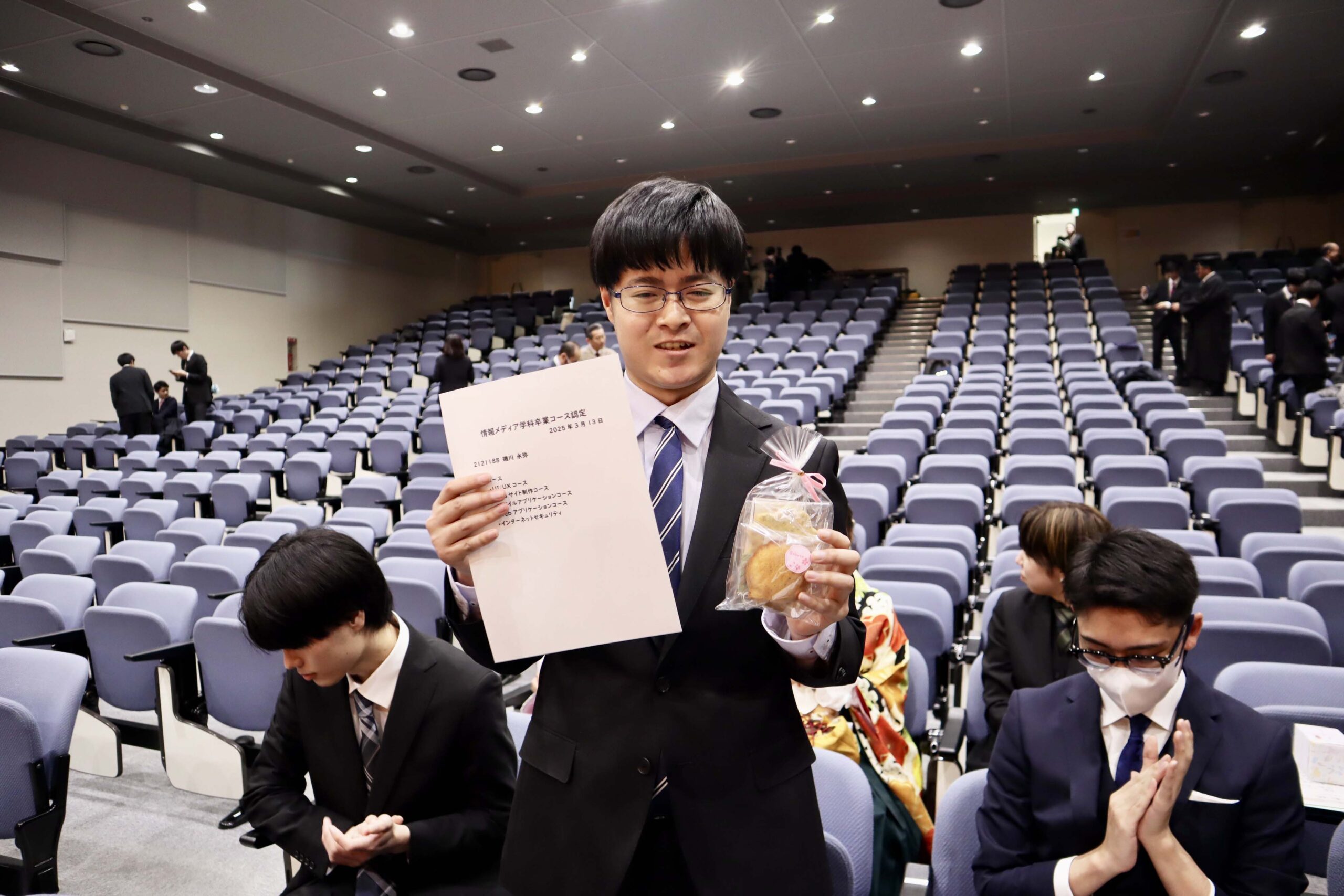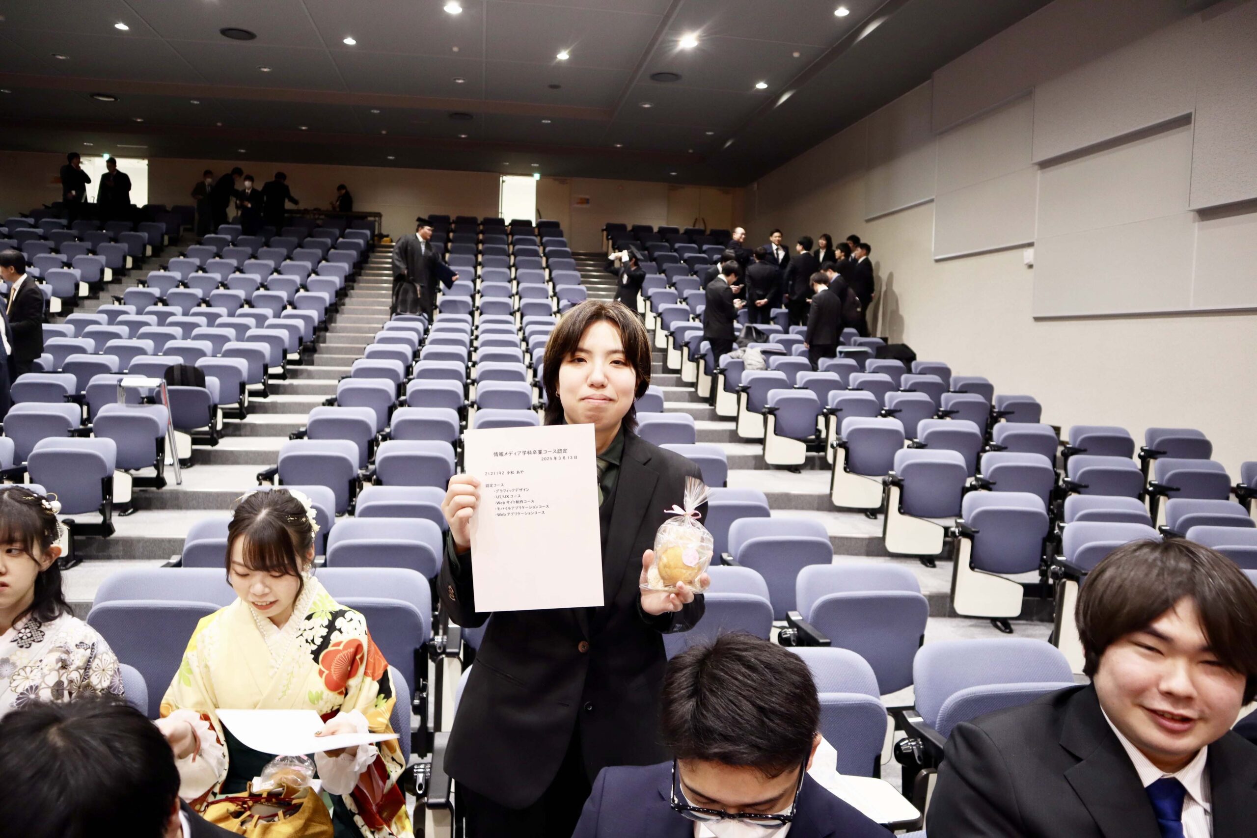 21期生たちの学位記授与式が行われました。今年度は、こまっちゃんが成績優秀者として表彰され、ゆいが講堂での代表で学位記授与を、もわが、学科別学位記授与を代表で最初に受けました。皆様、ご卒業、おめでとうございます。