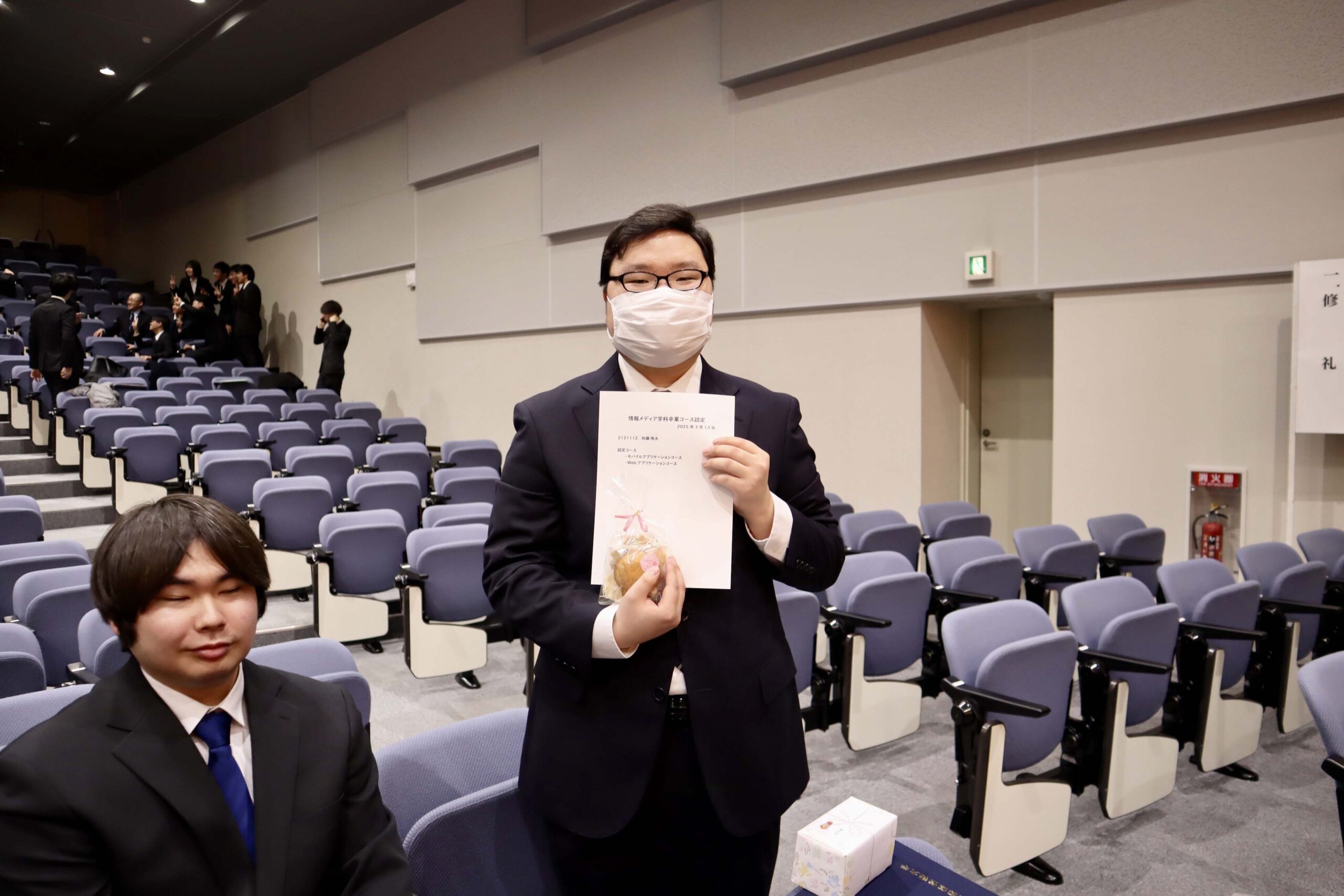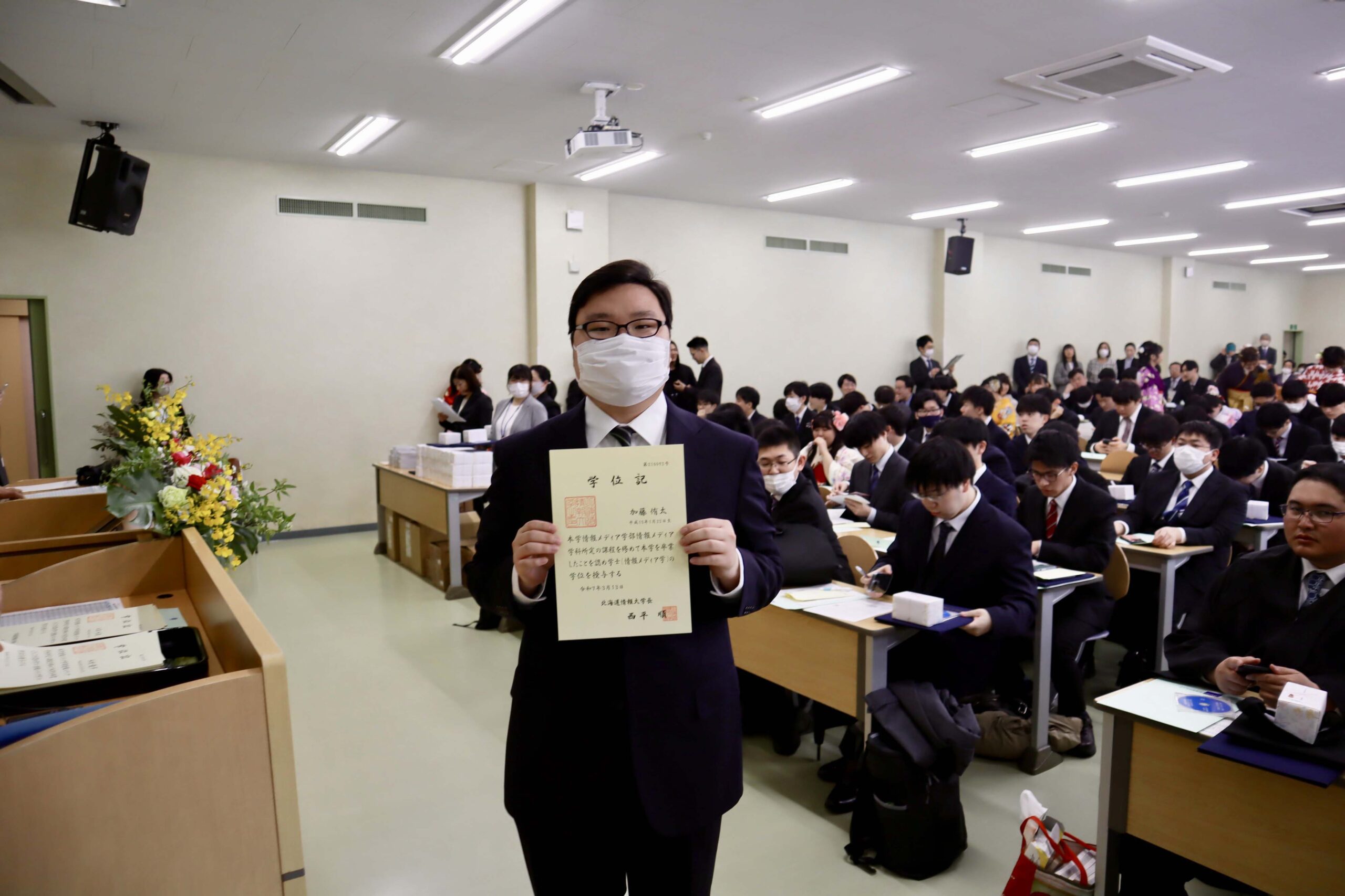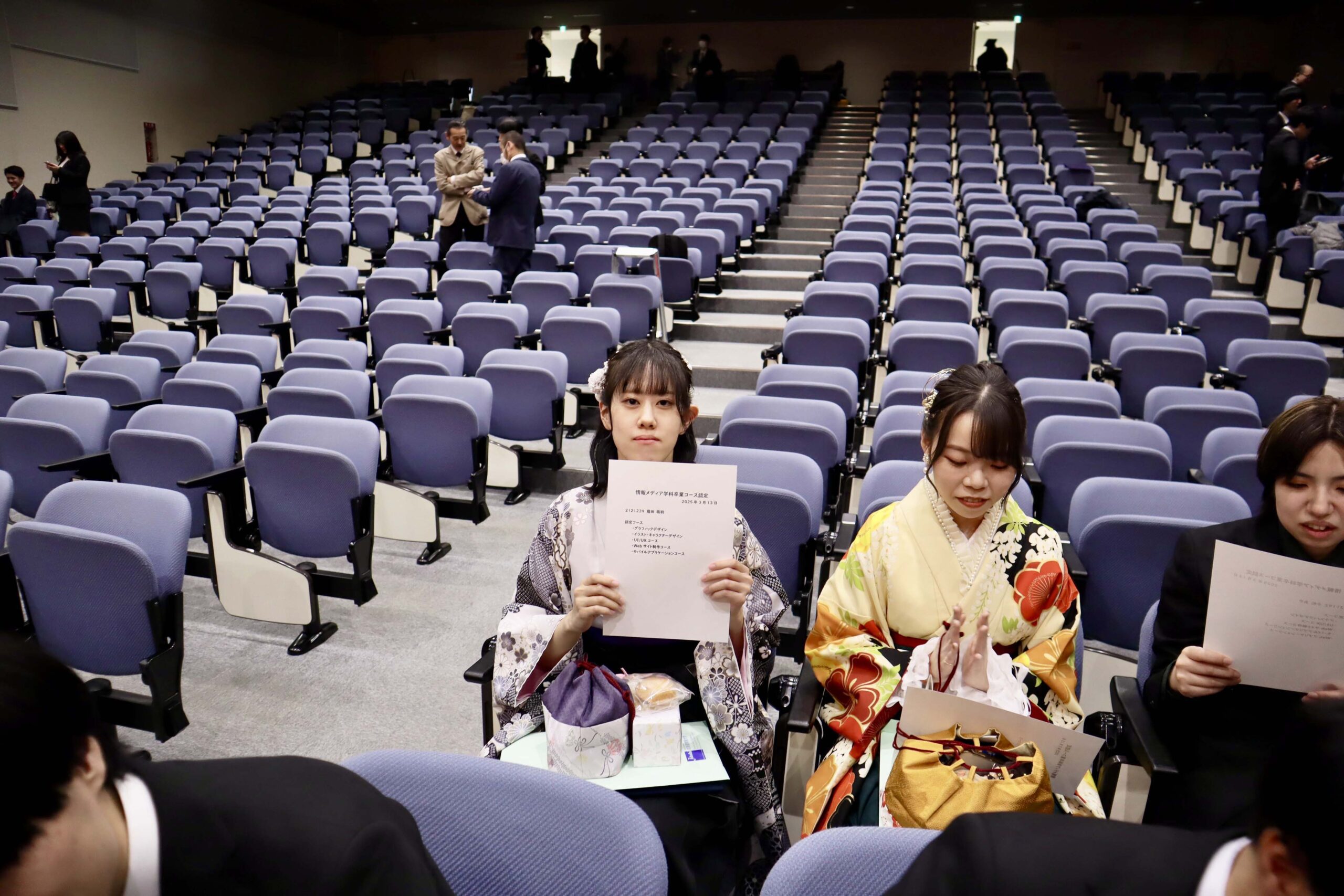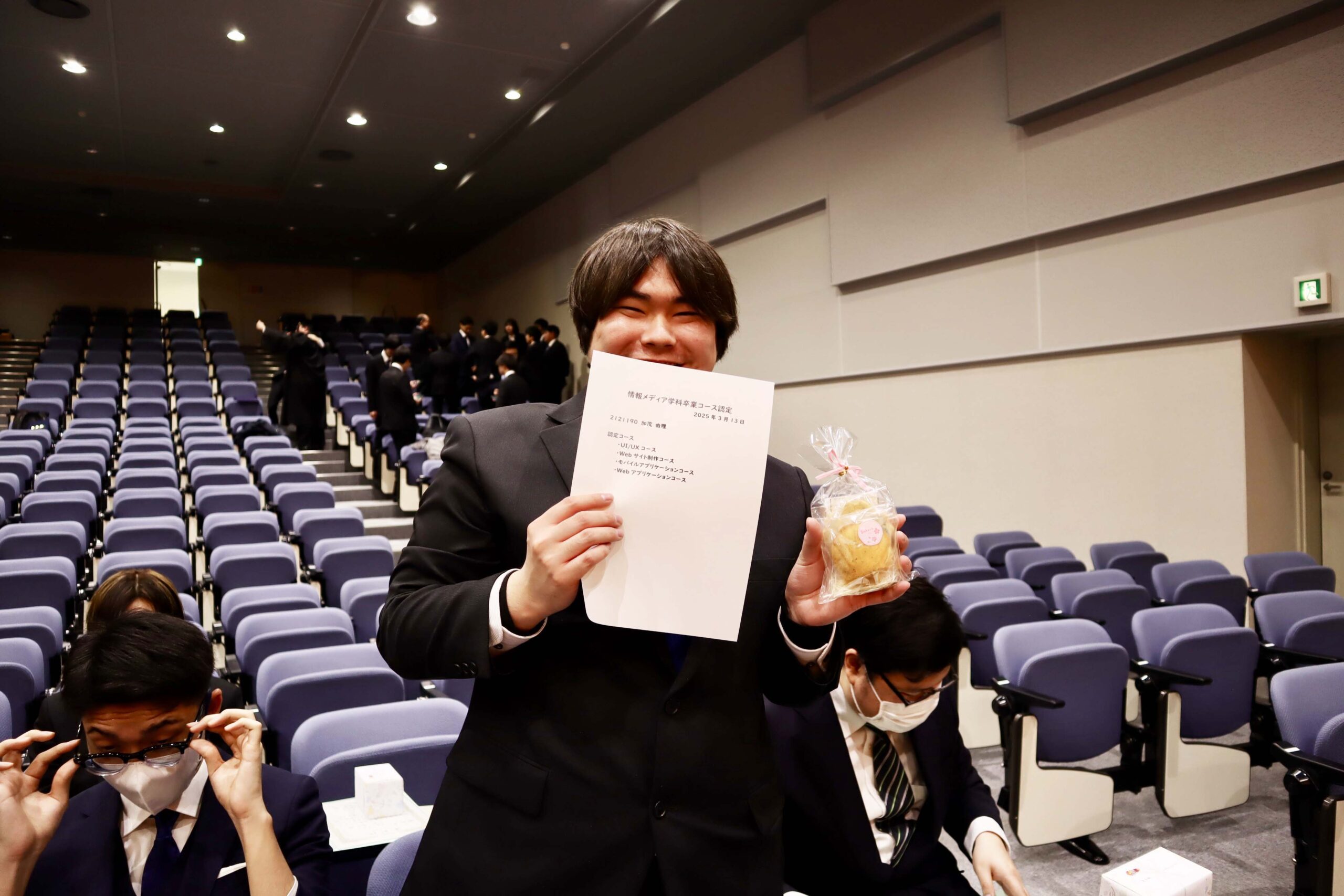 21期生たちの学位記授与式が行われました。今年度は、こまっちゃんが成績優秀者として表彰され、ゆいが講堂での代表で学位記授与を、もわが、学科別学位記授与を代表で最初に受けました。皆様、ご卒業、おめでとうございます。