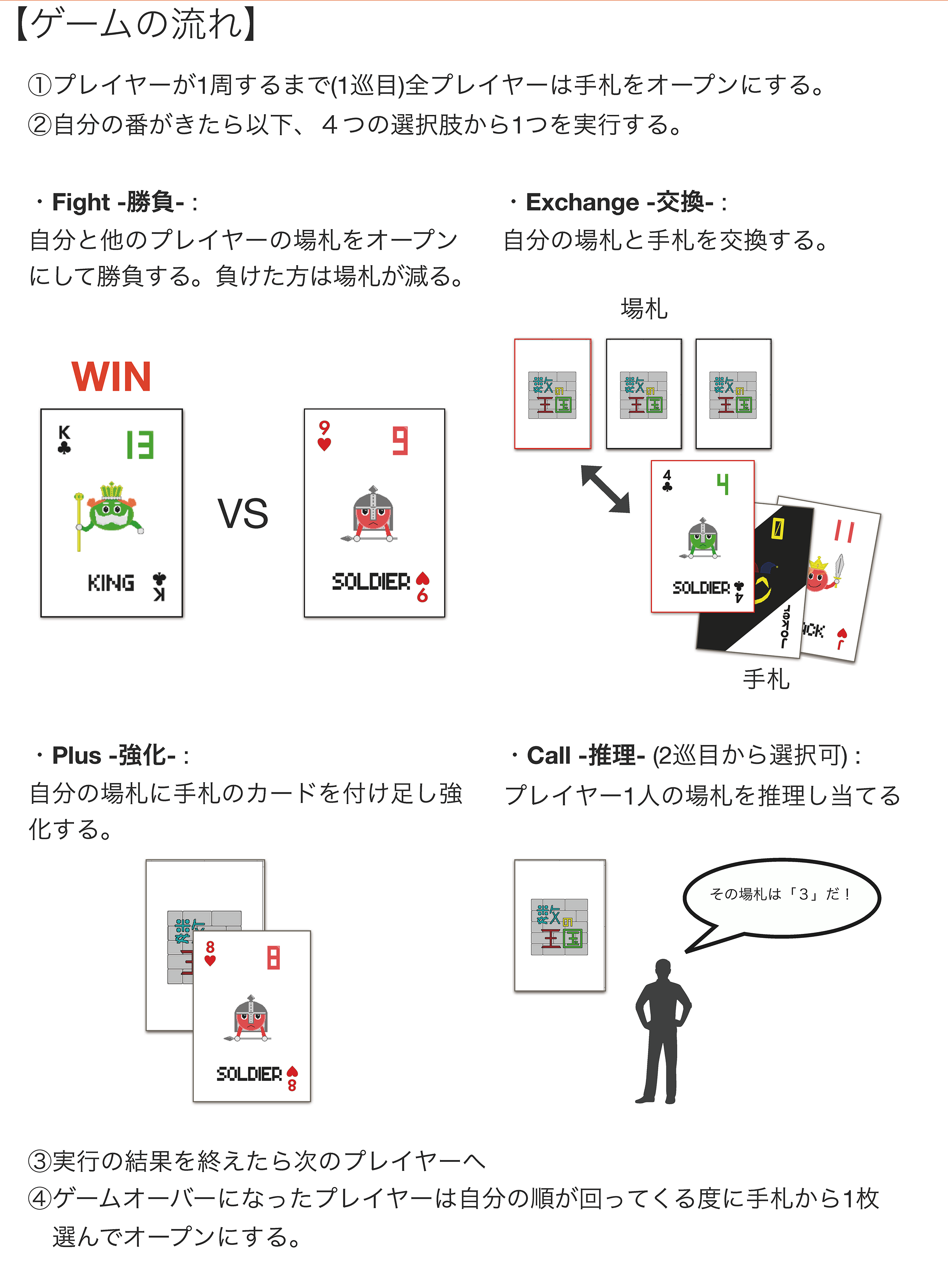 本研究では,(1)順序立てて情報を整理する能力,(2)目標までの道のりを推理する能力,以上を使った考え方を「論理的思考」と定義する。楽しみながら学習をすることを考慮し,(1)と(2)の能力を使うことによって論理的思考を鍛えることを意図したアナログゲーム「数の王国」を制作した。数の王国は,場の数字を戦わせ生き残ることを目的としたサバイバル形式のカードゲームである。プレイ人数は4人,中学生以上を対象としており,プレイ時間は10分から20分を想定している。数の王国は,市販のトランプでもプレイすることができる。
