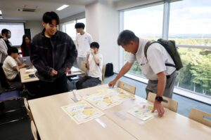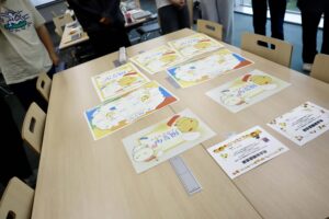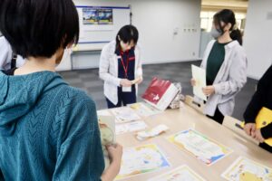 このあと、郵便局の方々にもまたまた大学に来ていただき、仕上がったポスターや台紙、そして、達成賞のクリアファイルなどを持ってきていただきました。
